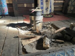 この様な隙間風が入る高床式住居で、囲炉裏で食事を作り暖をとります。